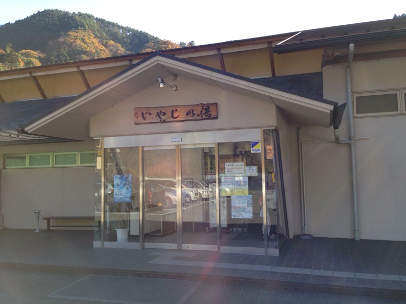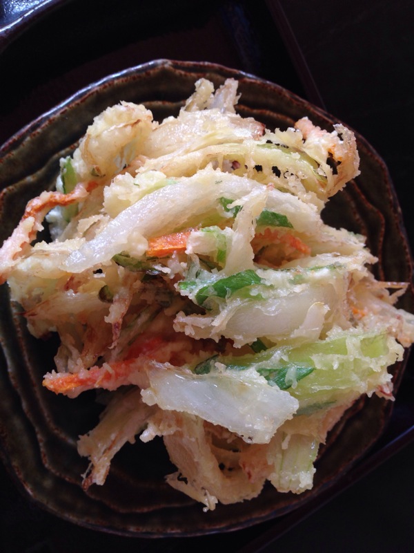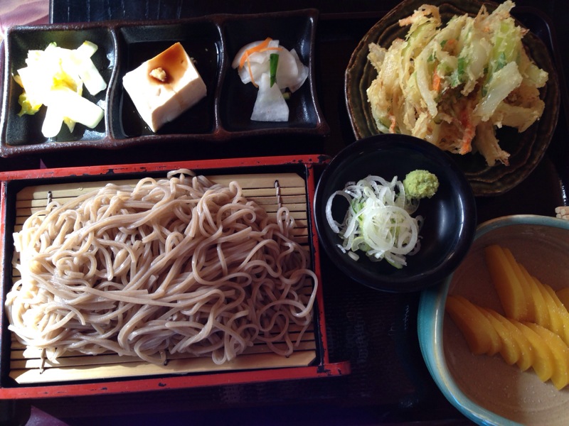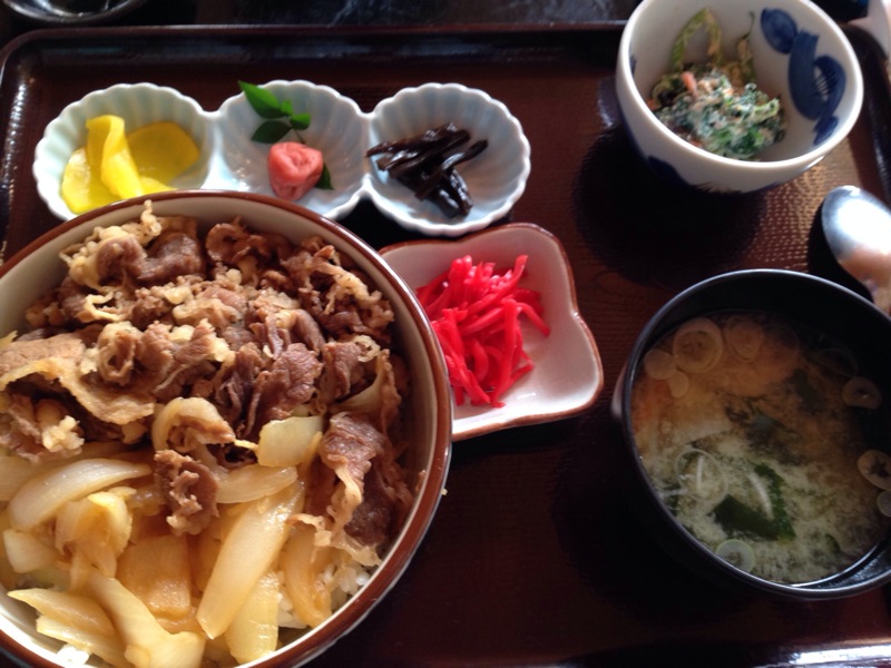 キャンプ場ではずーっと焚き火を付けっ放しでしたので、体中が煙の匂いでいっばい。 帰りがけに温泉に入ってさっぱりして、館内の食事処にてランチ。 父ちゃんはかき揚げ付きのざるそば、長女は牛丼。