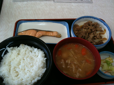 牛鮭定食のご飯大盛り、豚汁バージョンです。