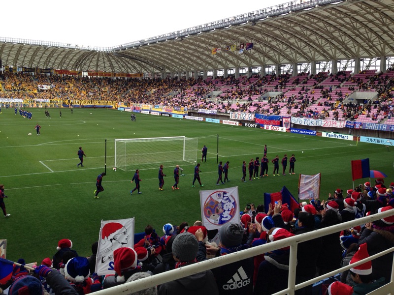 肝心のサッカーは、前半早々に先制されて、後半終了間際までそのままリードされて負けを覚悟したところで、FKで土壇場で同点。 天皇杯なのてそのまま延長戦に突入、これまた延長後半終了間際にPK戦を覚悟していたら、劇的な勝ち越しゴールで勝ち上がり。 観戦した皆で狂喜乱舞しました。