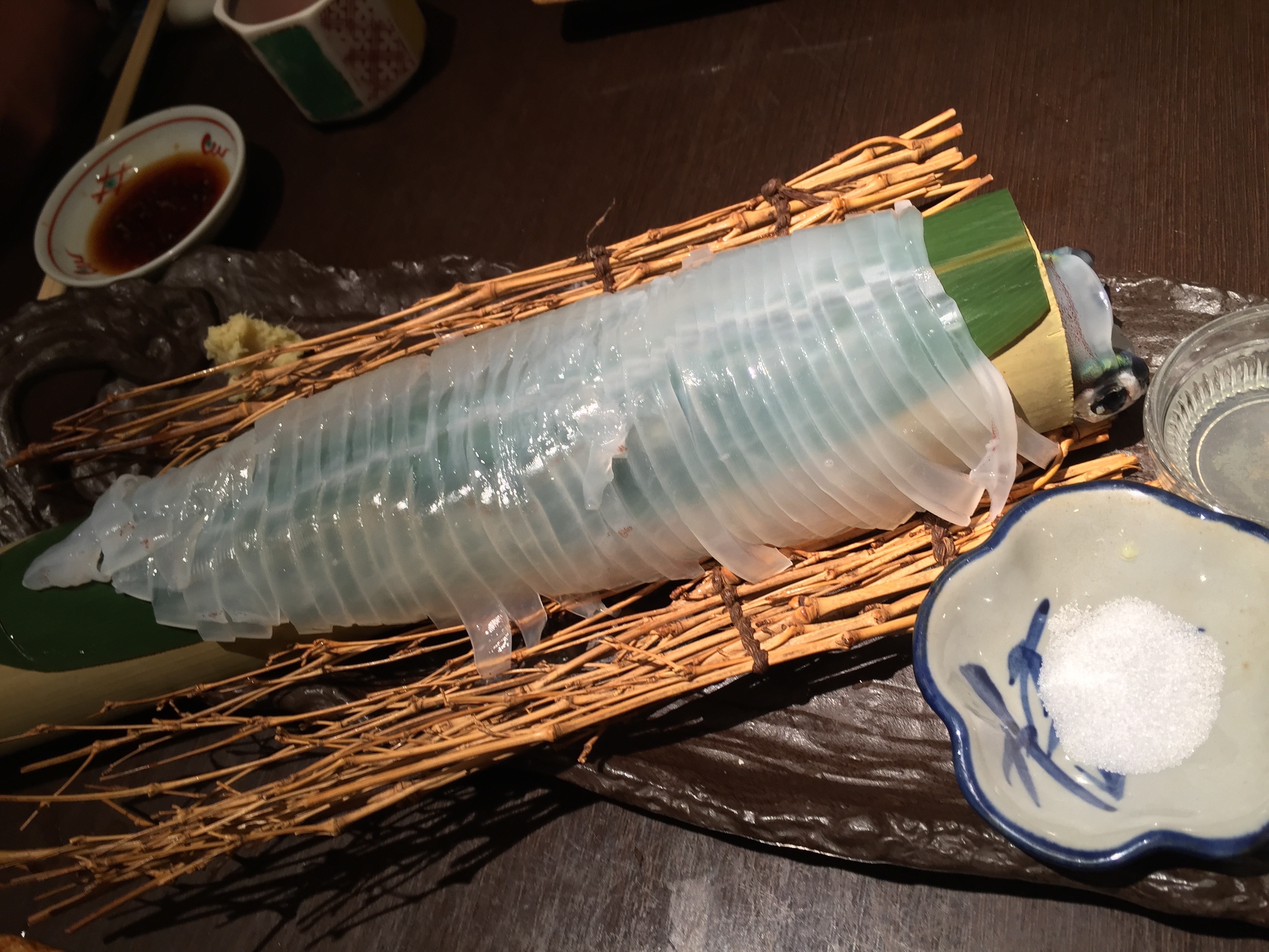 このイカ、美味すぎます。その他、キンメの煮付け、刺し身山盛り、わけわからないボリュームのおつまみ、飲みまくって5千円くらい。