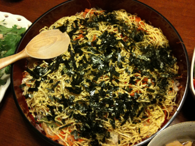 その本体の身といえば・・・衣をつけて揚げて大根おろしを乗せて出汁を回しかけて完成。大根おろしは長女と次女がおろしました。