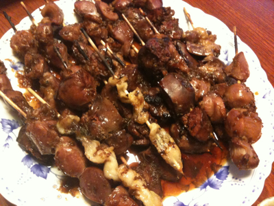 この日はジイジが焼き鳥を焼いてくれました。肉を買ってきて、切ってひとつひとつ串刺しに・・・